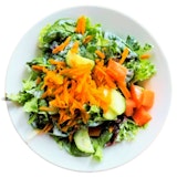 Romaine lettuce with shredded carrots, tomatoes, red cabbage, and cucumber