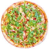 Sautéed prawns in white wine, tomatoes, green and red bell peppers, onions, spinach, and artichoke hearts with creamy garlic sauce on thin crust